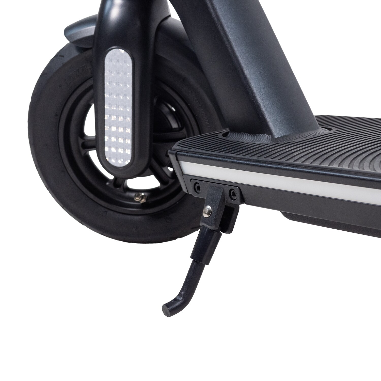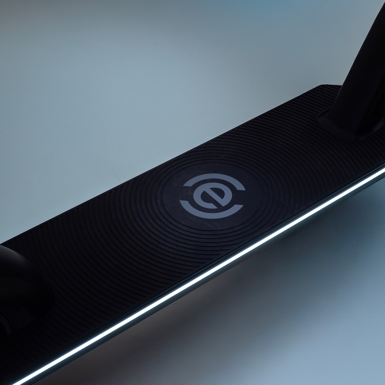 LM500 Pro har en robust men stilren design med ram i aluminium. Den extra breda fotplattan gör det möjligt att stå med båda fötterna parallellt – för en stabil och bekväm körställning. För ökad synlighet och säkerhet i mörker är fotplattan dessutom utrustad med integrerade LED-ljus på båda sidor. Scootern fälls enkelt ihop, vilket gör den smidig att ta med eller förvara.